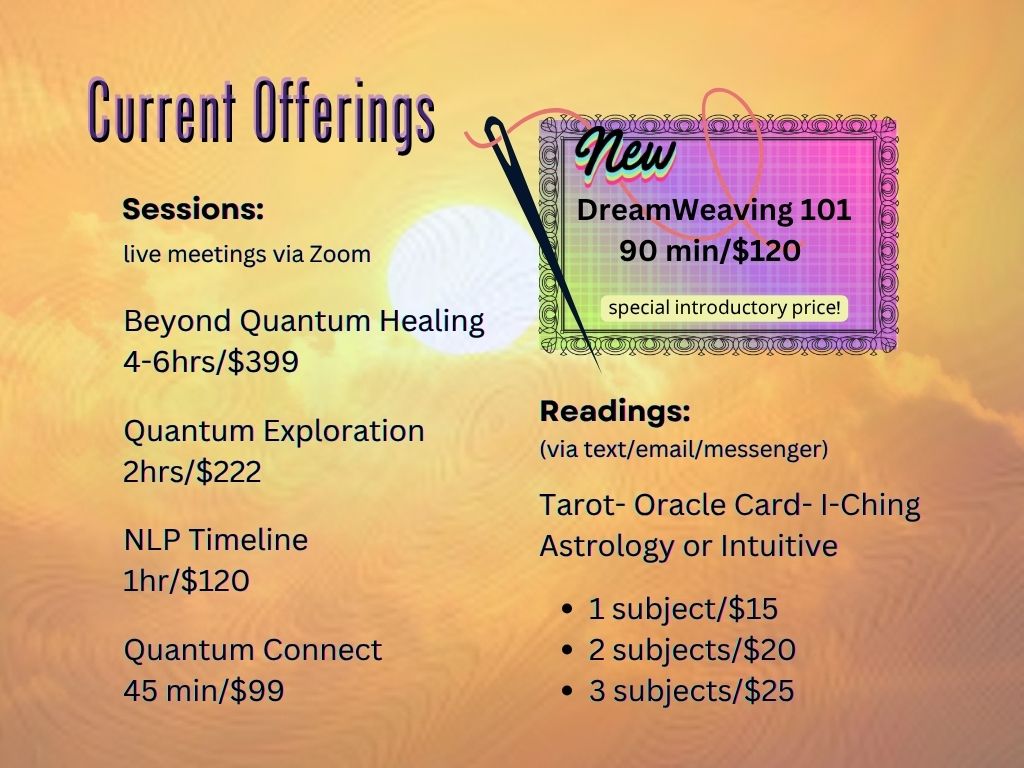 Why not harness this power with a guide who is well-versed in several systems? Whether you’d like an NLP Timeline session, a Past Life Regression, a Quantum Healing session, or a simple oracle reading, I can facilitate. If you are dedicated to your goal? So am I!