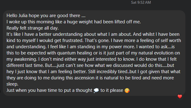 “Julia is an amazing quantum practitioner !!!I have tried SO many healing modalities for over a decade and this session with Julia finally got some things moving and releasing and continued for days after. This is serious healing work and she does it with such ease and joy that it just feels like you are talking with a friend and then suddenly so much starts to shift. We found an identity of mine stuck in a past life and released her. She guides you but does not over take or control your healing journey like some practitioners may attempt unknowingly. She truly understands the need to give the space you need as she gently guides you through in a very balanced and effective way. She is truly a rare gem. If you are after true healing and shifting look no further. She is here and she is magnificent !I can not recommend her enough !!!”